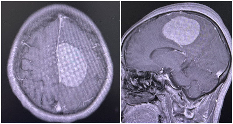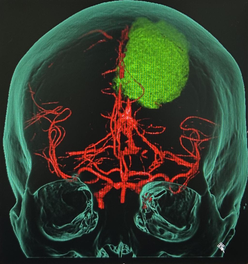 2024年10月,梁女士因左侧肢体麻木及行动不便在外院检查,头颅核磁共振结果提示左侧顶部占位性病变,性质不明。为求进一步诊治,她来到我院神经外科门诊。经神经外科首席专家李松年主任医师详细检查,考虑为左侧大脑镰旁脑膜瘤,更棘手的是,术前影像显示肿瘤与周围血管、功能区脑组织存关系密切。