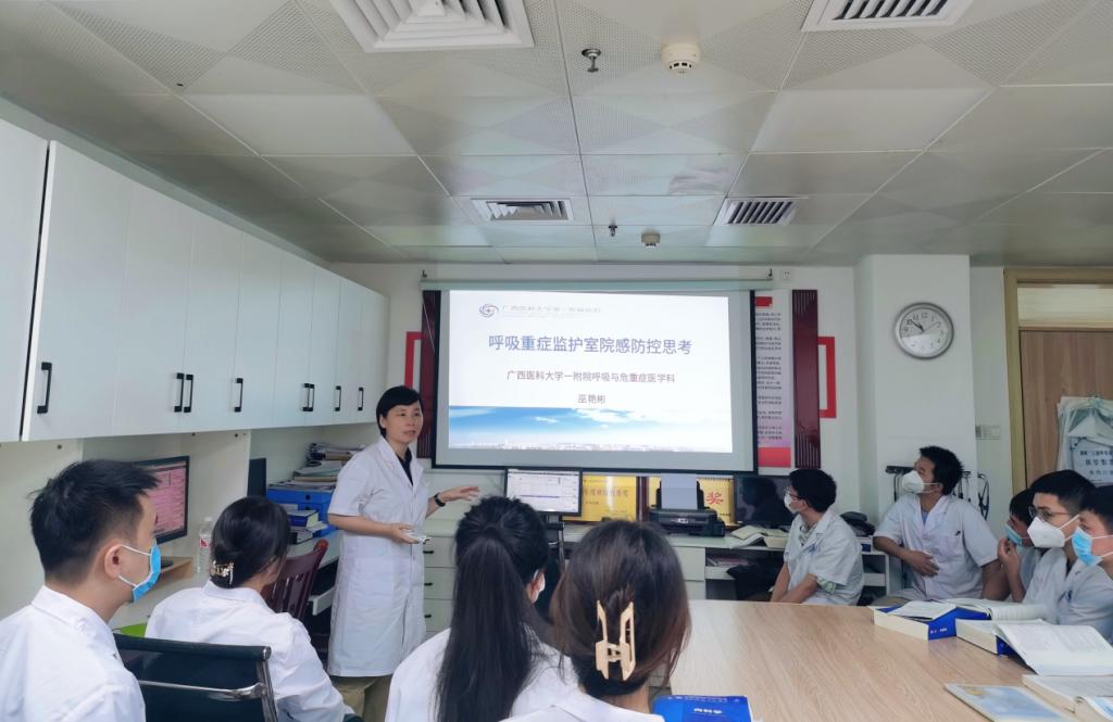 巫艳彬教授以《呼吸重症监护室院感防控思考》为题,为全体医护人员进行专题授课。授课内容涵盖呼吸与危重症领域的最新研究成果、临床诊疗的新技术和新方法,以及呼吸与危重症临床诊疗等方面的先进经验。授课过程中,巫艳彬教授强调学科交叉与融合的重要性,鼓励医护人员刻苦钻研学习专业知识、积极拓宽视野,融合学习其他相关学科的知识,以便更好地应对临床工作中的各类挑战。