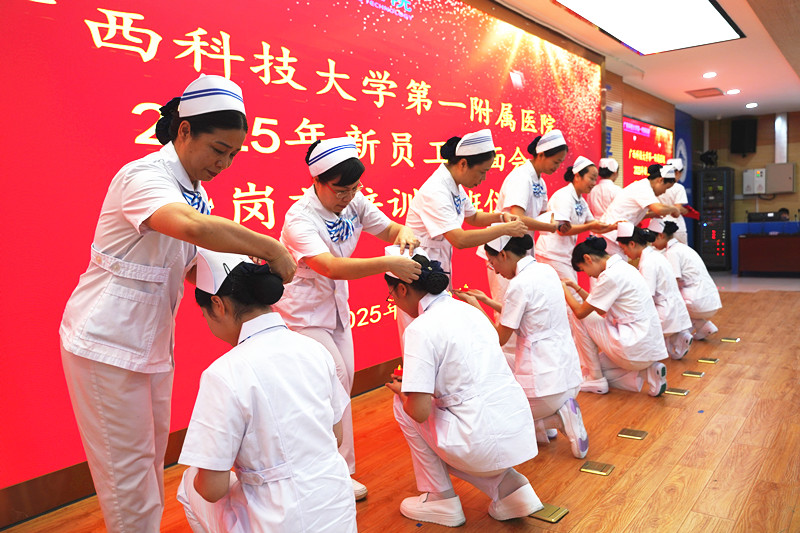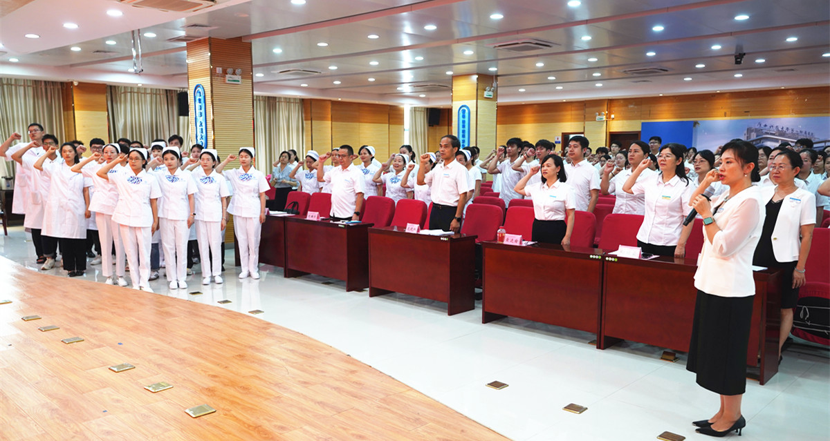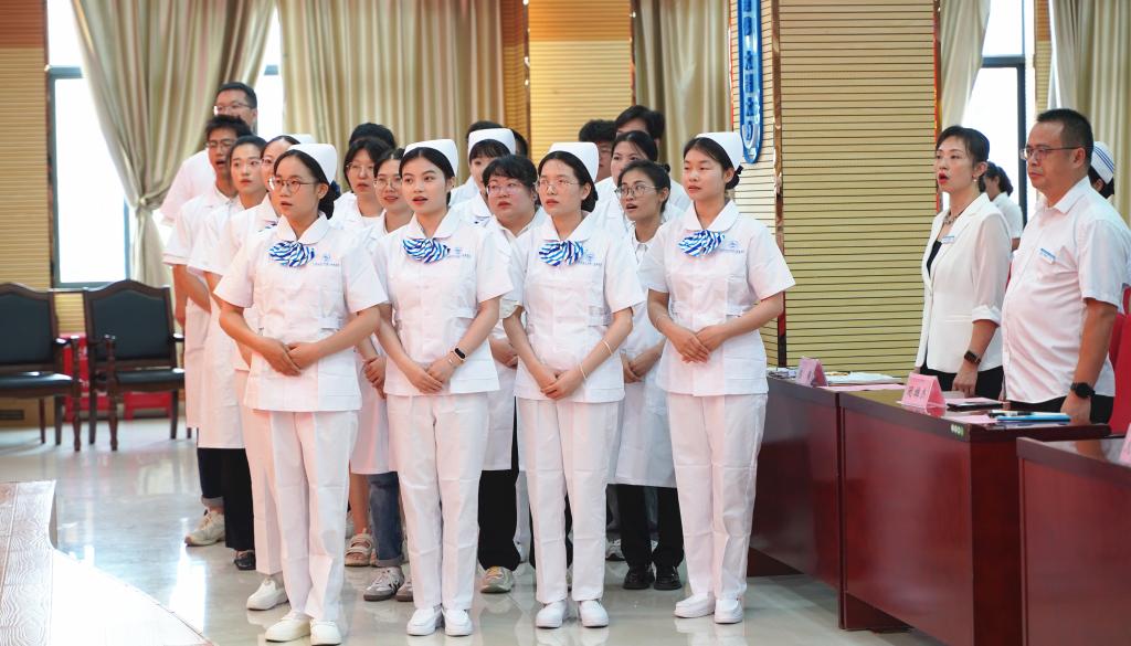 会上,黄进瑜副院长给新入职医师代表授听诊器;由陈瑞副院长领誓,全体人员重温医学生誓言;护理部主任等为新入职护士代表授护士帽;全体人员合唱院歌。
