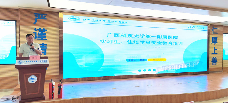 2025年7月28日下午,广西科技大学第一附属医院在学术报告厅开展实习生、住培学员安全生产动员会。会议由教学科科长袁俊主持,医院全体实习生和住陪学员共300多人参加培训。