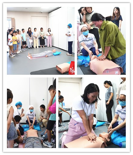接着,急诊医学科张杏萍医师、梁琪琪主管护师现场演示心肺复苏(CPR)基本技能,专业导师手把手示范教学,让大家在拟真人形模型上实操练习,帮助大家更好掌握危急时刻“黄金4分钟”救命技能。