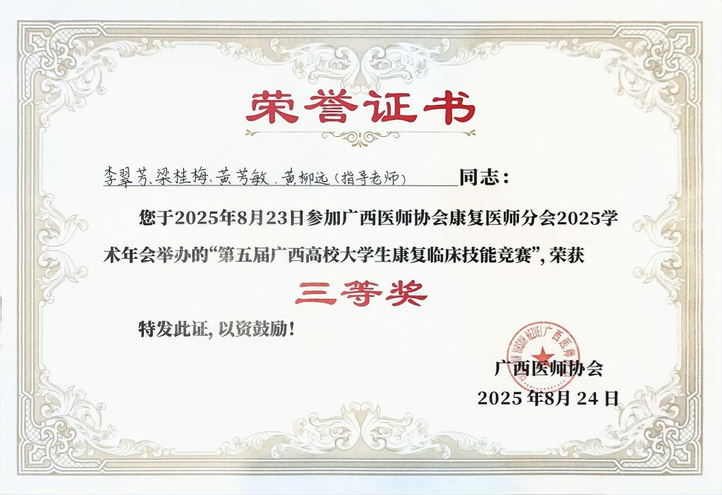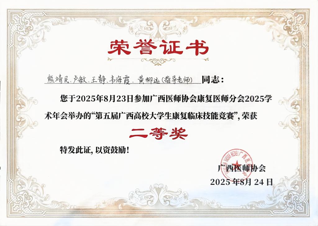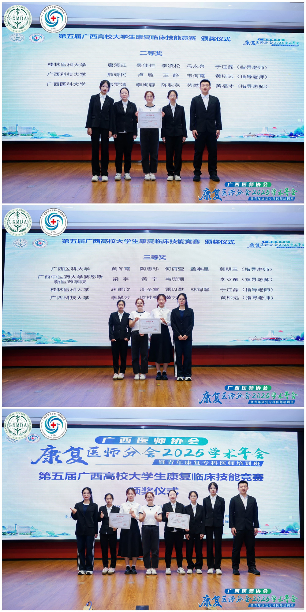 热烈祝贺!在2025年8月23日-24日由广西医师协会康复医师分会举办的第五届广西高校大学生康复临床技能竞赛圆满落幕。广西科技大学第一附属医院康复治疗学221班的2队参赛队伍不负众望,在51个参赛团队中脱颖而出,一举斩获决赛二等奖与三等奖的好成绩,用实力书写了我校康复治疗学专业人才培养的亮眼答卷。