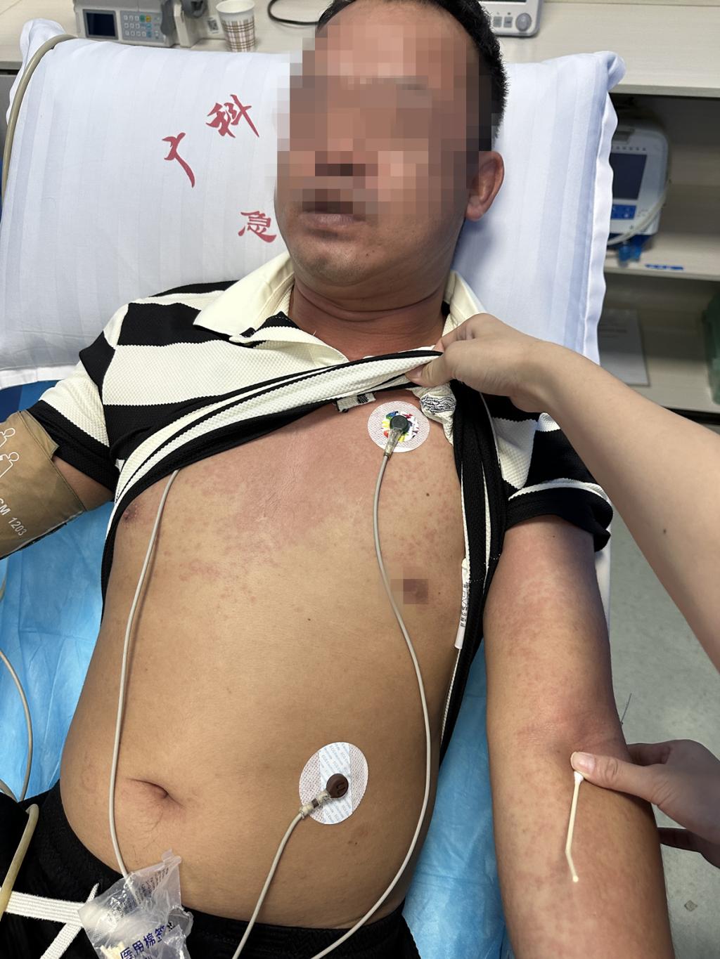 经了解男子因在厨房煮菜时脖子有火辣辣感觉,接着头皮发麻,头面部、嘴唇皮肤厚重感,上半身奇痒难受。马上洗澡换了一条裤子,感觉症状更加严重,头昏眼花、全身无力!马上骑车来长塘卫生院。路上才发现裤子里全是蚂蚁,但是已经特别难受,来不及返回更换。13:53分来到长塘卫生院时已经讲话不利索,立即进入昏迷状态!医护人员测血压才是50/35㎜Hg,马上转到抢救室,输液、肌注肾上腺素。男子很快就醒来了,但自认为不严重拒绝转院。梁琪琪她们来到后,再次使用肾上腺素,并与当地医生一起劝导,男子才同意转回一附院急救。