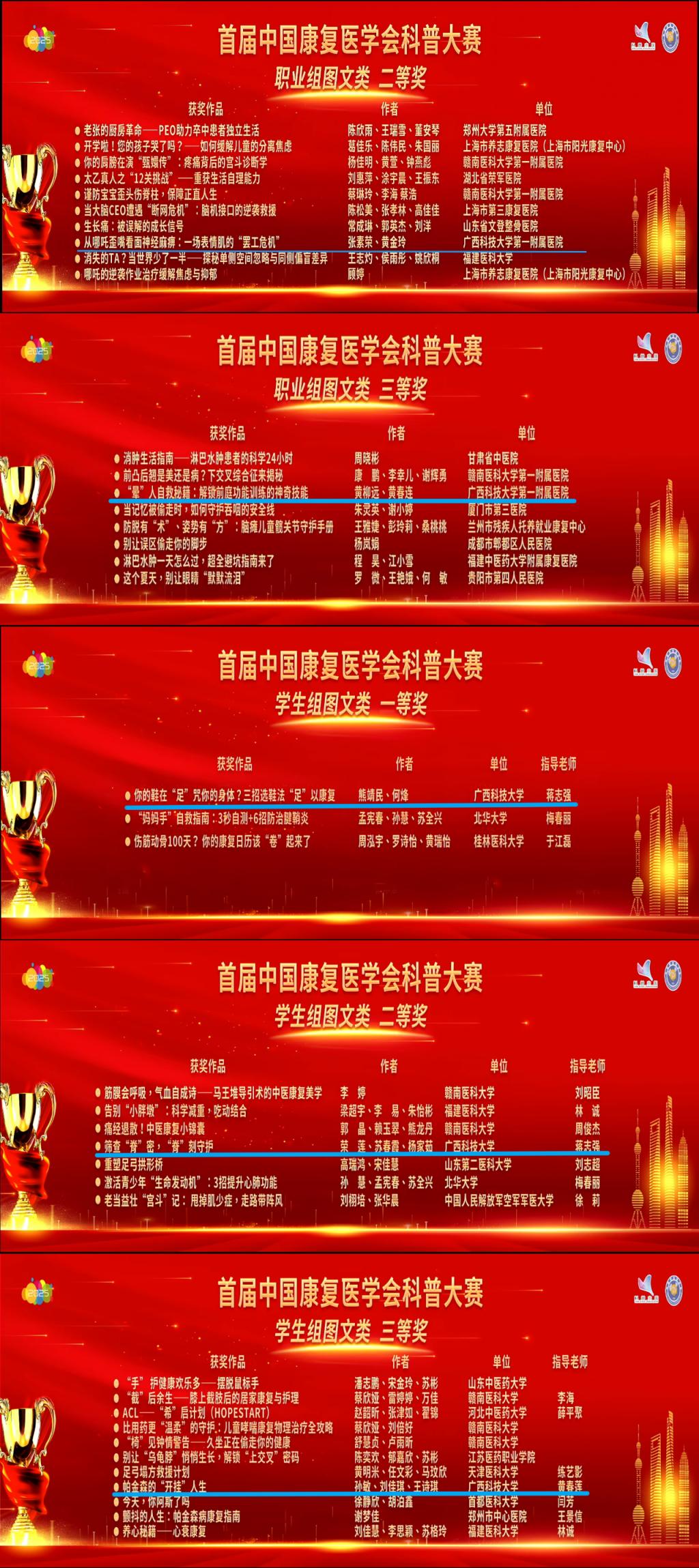 本次大赛的丰硕成果,是对广西科技大学及其第一附属医院在康复医学领域科研教学、临床实践与科普宣传工作的高度肯定,也将进一步激励广大师生和医务工作者投身健康科普事业,为提升全民健康素养作出更大贡献。(文字来源/宣传科 辜丽娜 图片来源/康复医学科)