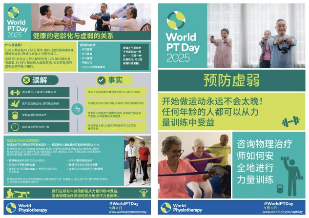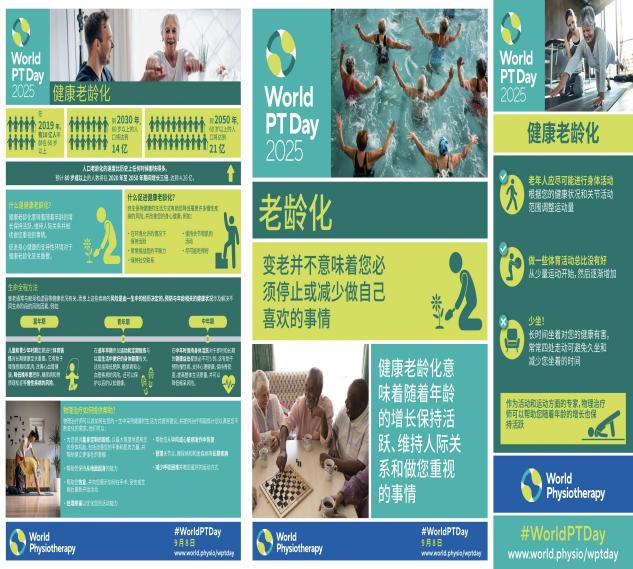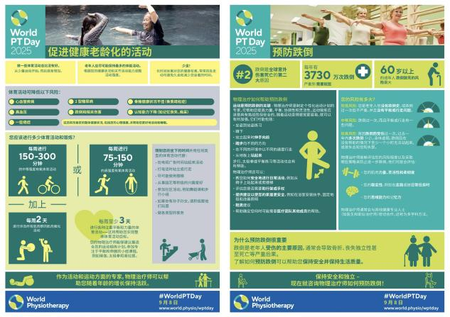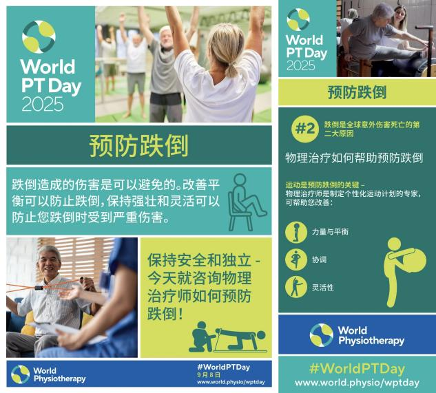 2025年9月8日是第30个世界物理治疗师日。1951年9月8日WCPT的正式成立,1996年起将每年的这一天设定为世界物理治疗师日。今年,世界物理治疗师日的主题是“健康老龄化:物理治疗与体育活动的作用”,重点关注预防跌倒和虚弱,助力每一位长者享受更有活力的晚年生活。