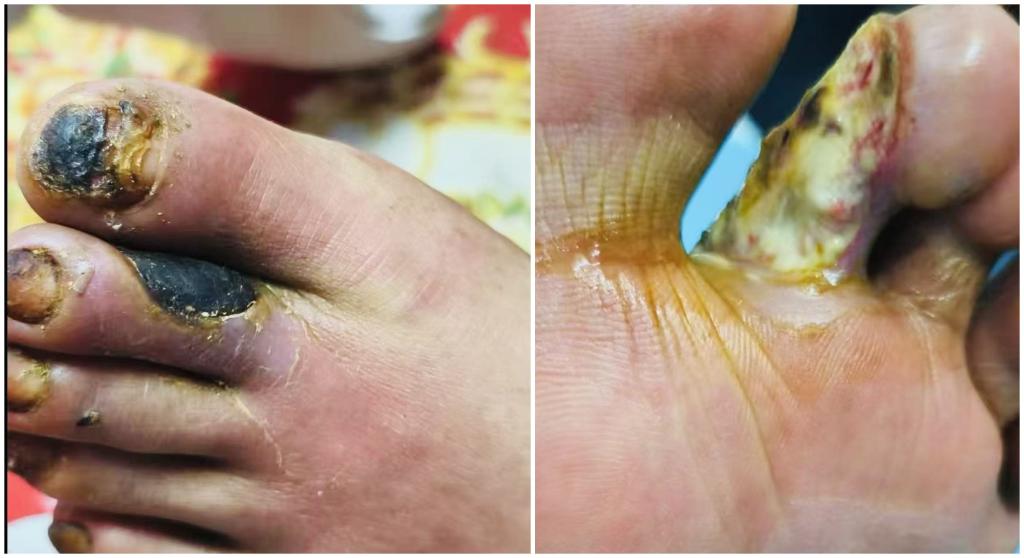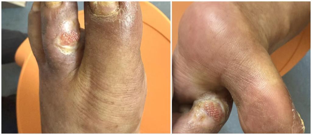 患者李先生有20余年糖尿病病史,半年前无明显诱因出现左足脚趾局部破损,后续伤口愈合情况不佳,不仅偶有渗液,还逐渐侵蚀,伤口范围持续扩大。期间患者未进行特殊处理,虽无肢体麻木、乏力等不适,但伤口始终迁延不愈,为寻求进一步治疗来到我院神经外科就诊。