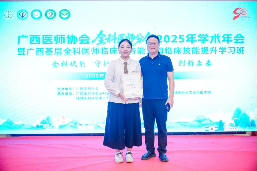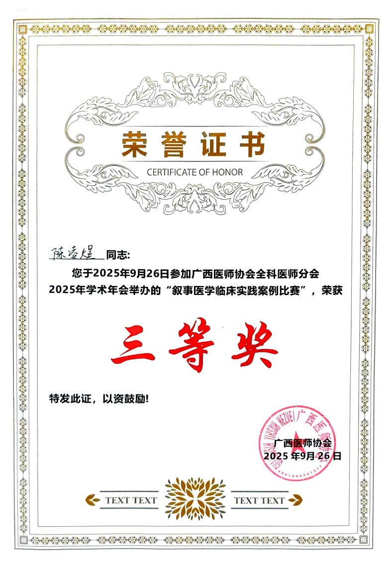 2025年9月26日,在桂林举办的广西医师协会全科医师分会2025年学术年会的全区叙事医学临床实践案例比赛中,广西科技大学第一附属医院新入职医师陈凌煜荣获三等奖!这不仅是个人的荣誉,也是对全科医学科医师坚持 “以患者为中心”的莫大鼓舞,更是对我院长期践行叙事医学理念的肯定。