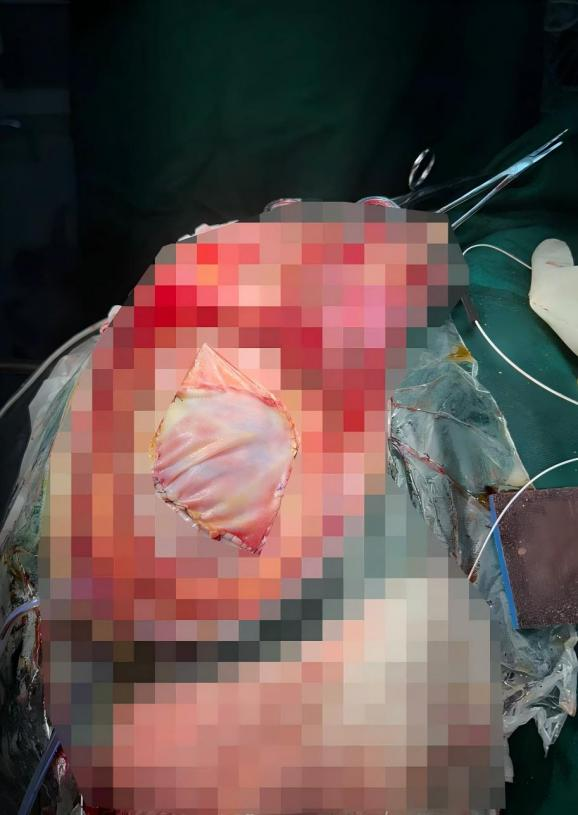 随着血肿被彻底清除,受压的脑组织逐渐恢复了搏动。随后,团队为患者置入了颅内压监测传感器,以便术后精准管理;用硬脑膜补片进行了减压缝合,为可能出现的术后脑水肿预留了缓冲空间;并使用先进的聚醚醚酮材料对颅骨进行了复位与固定。术中出血约600ml,在麻醉团队和手术团队的紧密配合下,输血过程平稳,患者生命体征始终维持在可控范围。