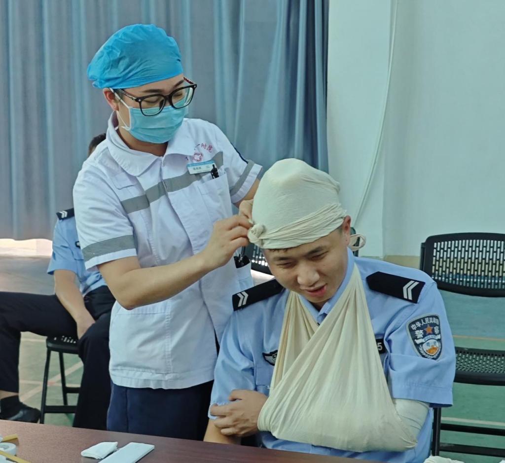急诊科毛力红主管护师、梁琪琪主管护师在对学员进行外伤止血包扎急救培训