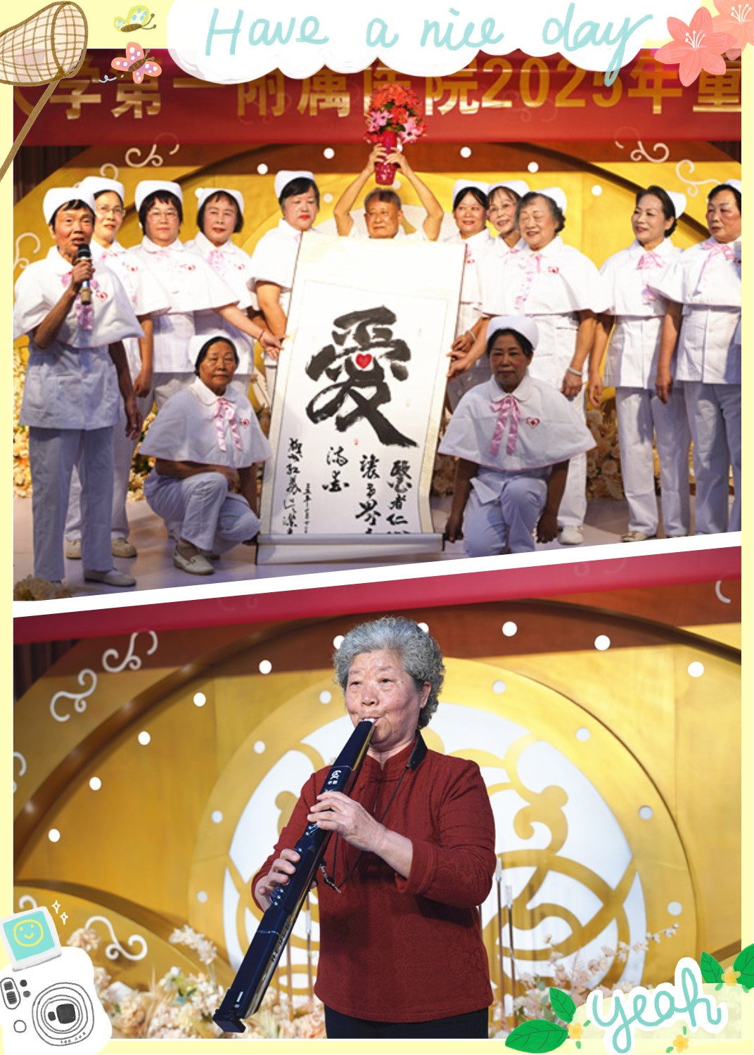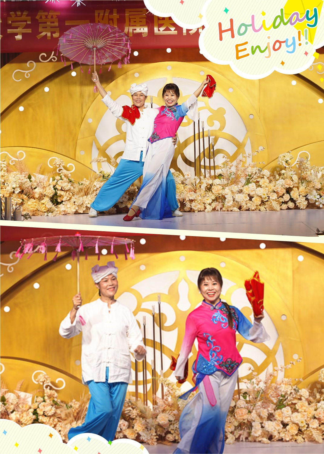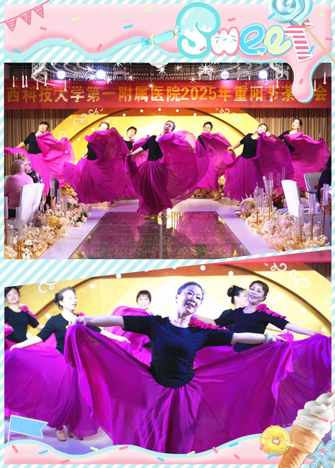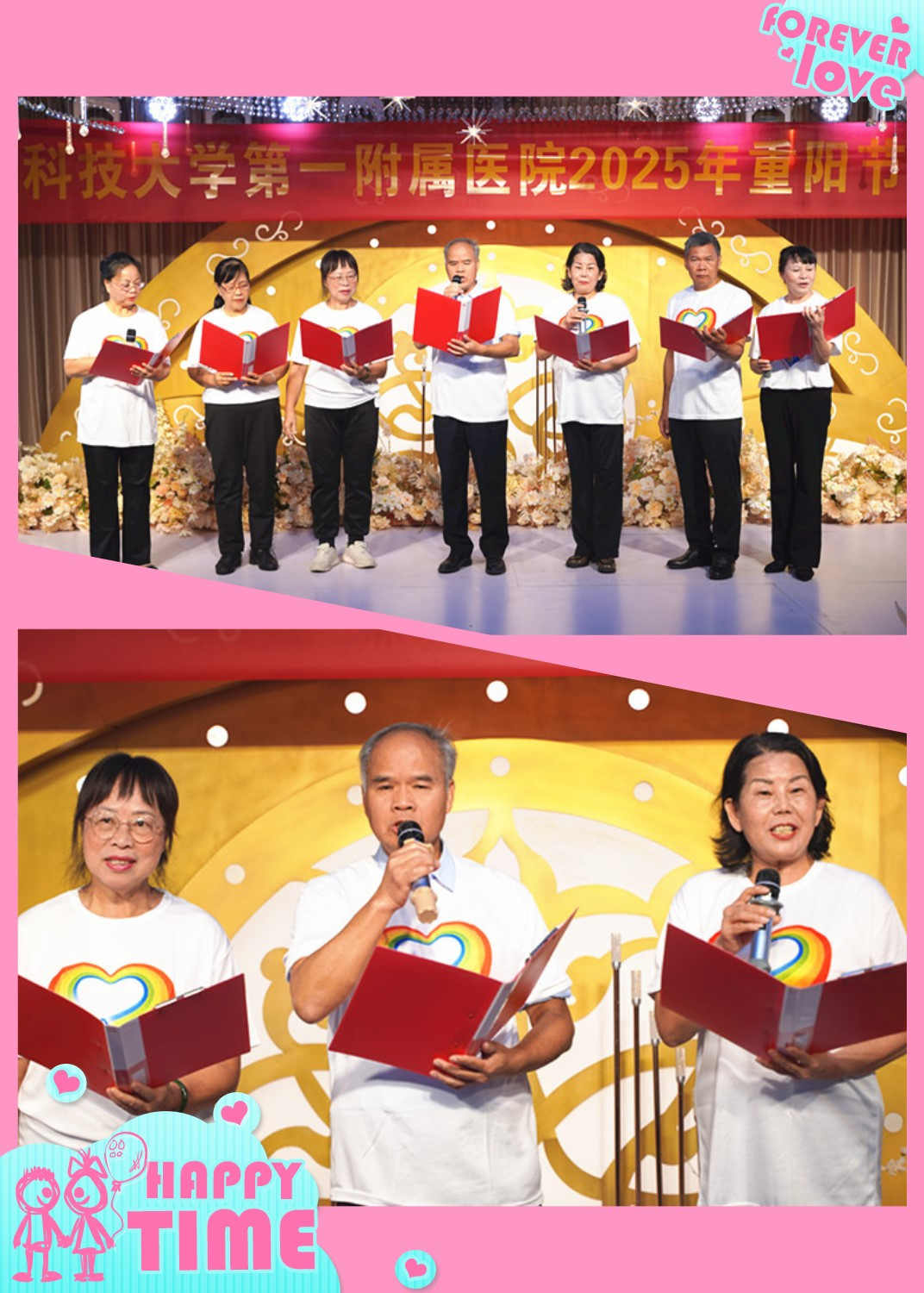 离退休职工还进行了文艺节目助兴表演,小组唱《白衣战士》、双人舞《小俩口》、电吹管演奏《我和我的祖国》、舞蹈《春之歌》、小组唱《绣红旗》和诗歌朗诵《唱重阳》等,展示了正值风华、才艺俱佳的精神面貌。
