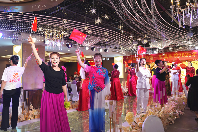 茶话会在院歌《生命的希望》和《没有共产党就没有新中国》激昂的歌声中拉开序幕,大家手摇小红旗共同歌唱,现场氛围热烈。