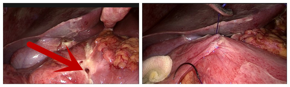 37岁男性患者唐某,因突发腹痛8小时于2026年1月8日急诊入院,呈刀割样剧烈疼痛,难以忍受。入院查体:急性病容,腹肌紧张,上腹部、右上下腹部压痛、反跳痛明显,肠鸣音减弱,约1次/分。腹膜炎体征明显,入院予急诊完善腹部CT检查提示:1.气腹,考虑消化道穿孔。2.阑尾粪石,并阑尾炎。3.腹腔积液。因病变部位不同,胃穿孔的病变解剖部位在上腹部,阑尾炎的病变解剖部位在右下腹,考虑要兼顾上下腹、充分显露手术部位等,传统手术需在腹壁开10cm-15cm的较长切口,手术创伤大,恢复慢。医生决定采用腹腔镜手术,只在腹壁打3-4个0.5cm-1.0cm戳孔就能完成手术。