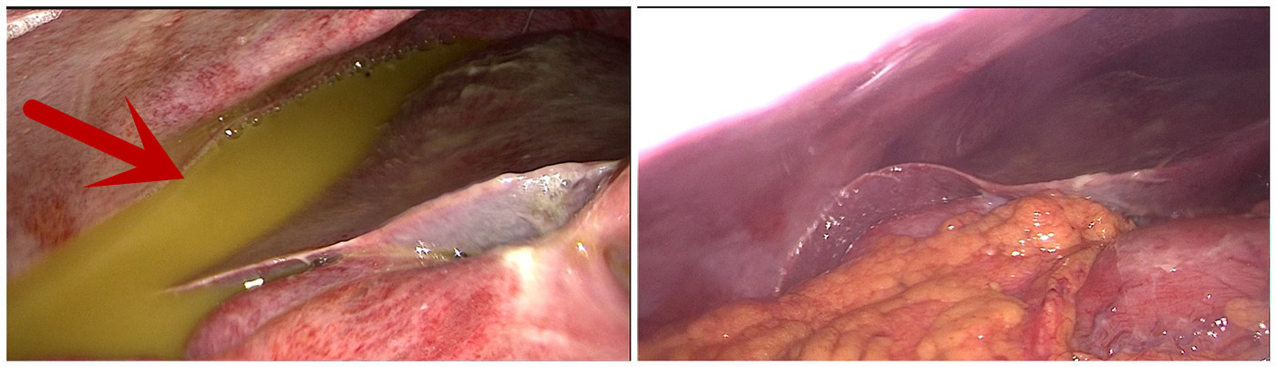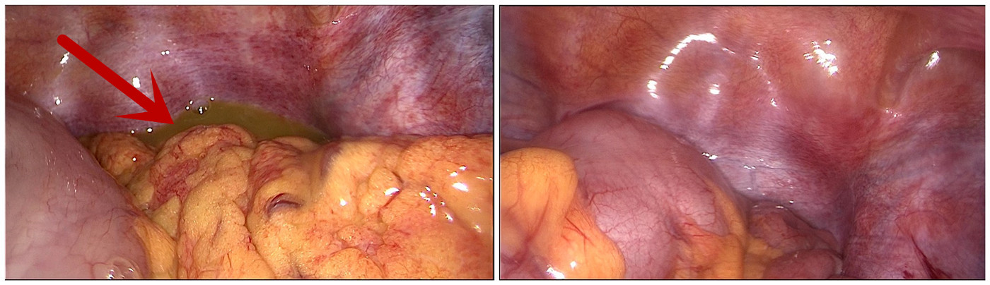 术前(腹腔):腹腔积脓 手术冲洗干净后(腹腔)