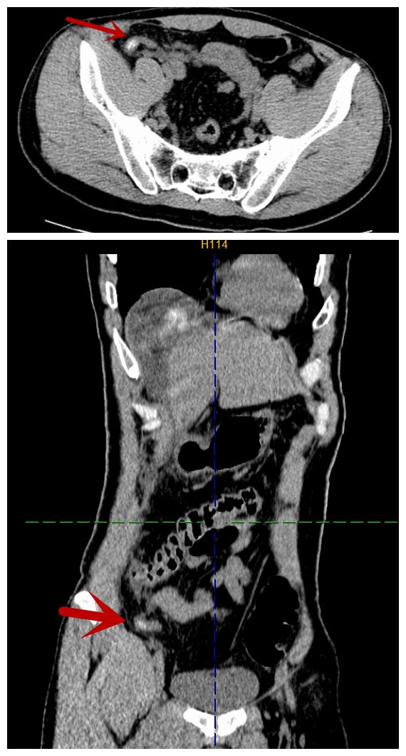 术前CT,箭头所指为阑尾肿胀伴有粪石