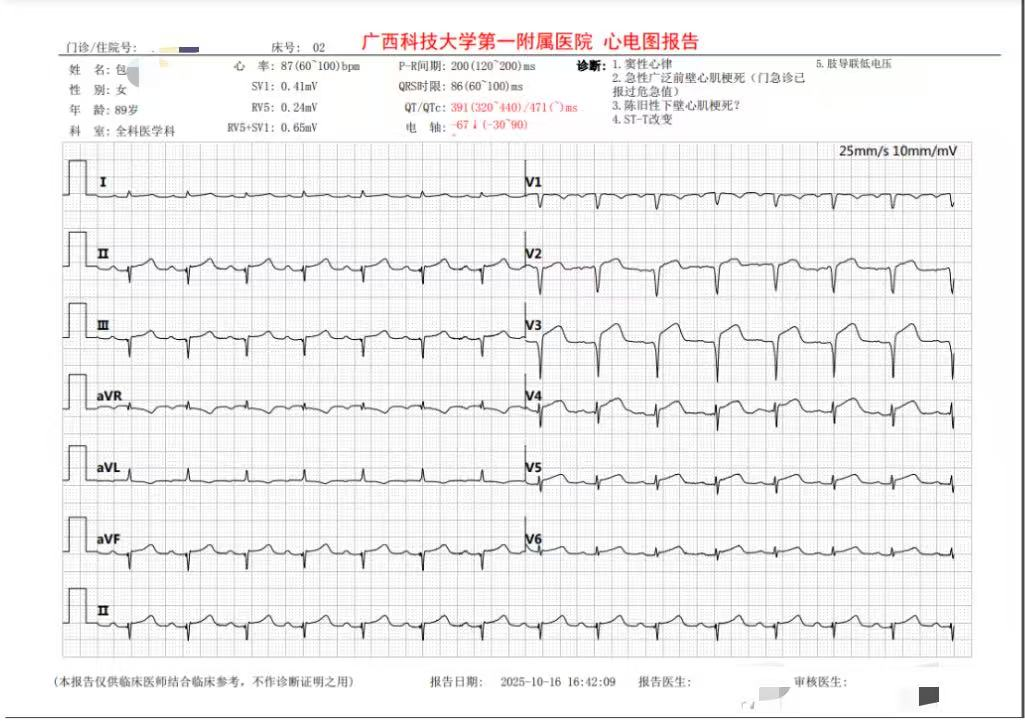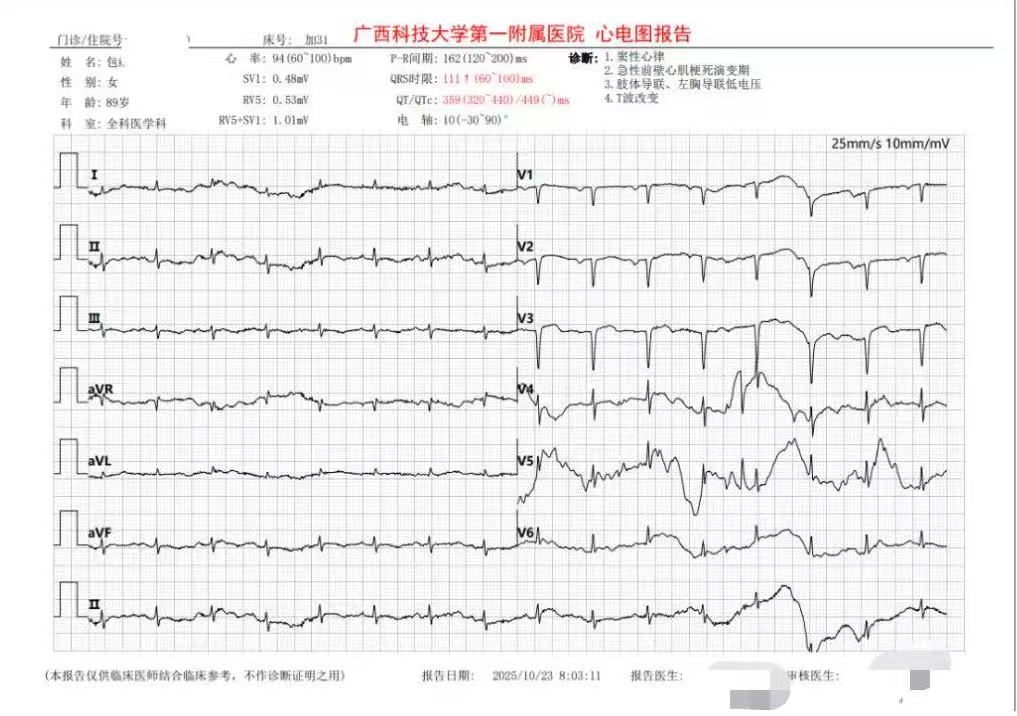 前段时间,90岁的包奶奶因“呼吸困难8小时余”紧急入院,嗜睡、失语、酸碱失衡,身体各项指标频频亮起红灯。血气分析pH值低至7.16,二氧化碳分压高达61.20mmHg,心肌损伤标志物显著升高,心电图ST段抬高,诊断急性心肌梗死、急性呼吸衰竭、肺部感染、混合性酸中毒……每一项诊断,都是敲响死亡的警钟。经过多科室会诊,建议立刻收治重症监护室行冠状动脉支架植入术。但家属考虑患者高龄结合自身经济情况,不同意手术及住监护室。就在家属开始准备后事的时候,全科医学科负责人、主任医师李政宁跟家属充分沟通病情,家属又燃起了生的希望,最终同意到全科医学科住院做进一步治疗。