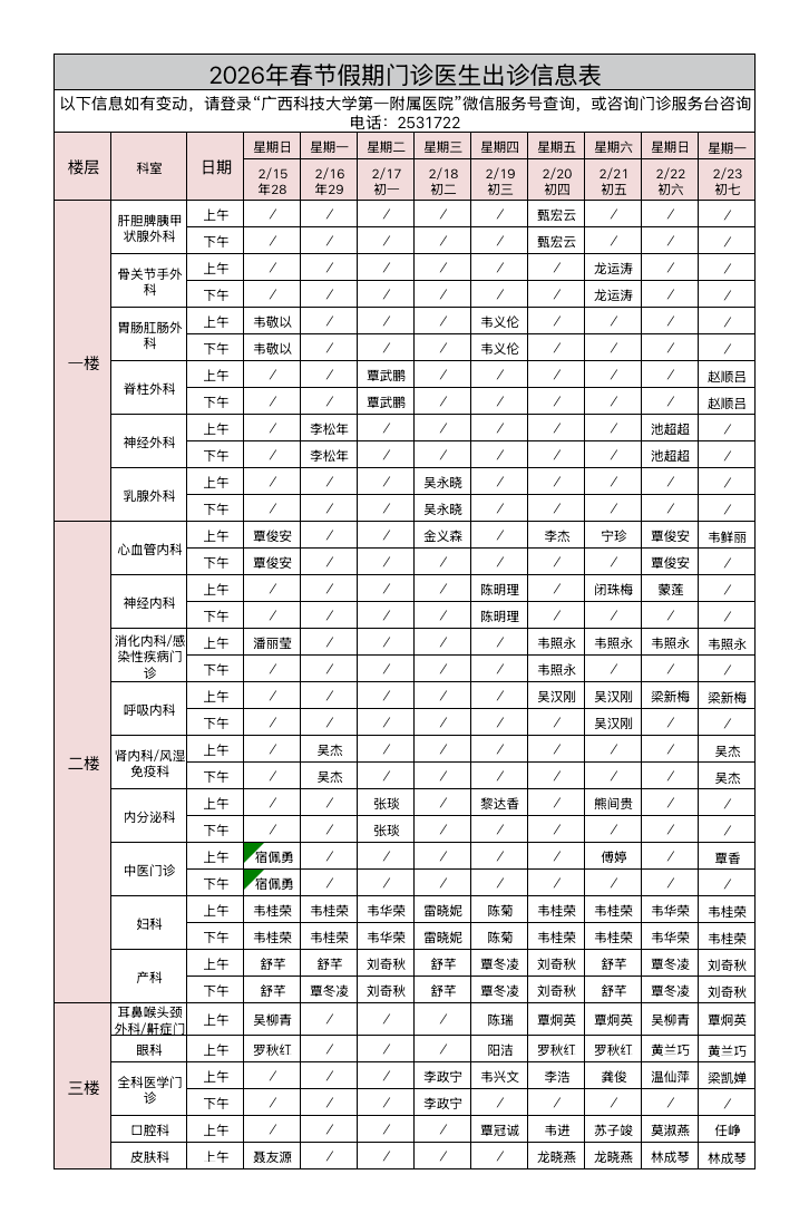 二、内科、外科、妇产科均安排有医师出诊(见下表),具体出诊医师请登录“广西科技大学第一附属医院”微信服务号查询或咨询门诊服务台。