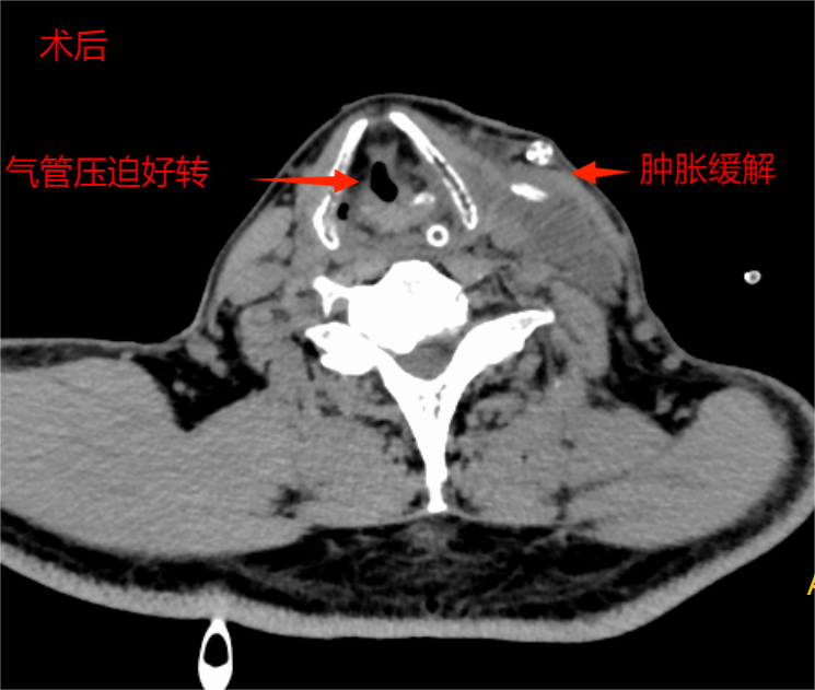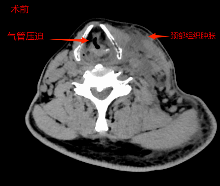 1月25日,李伯无明显诱因下开始出现发热、咽痛,同时自觉左侧脖子疼痛,开始以为吃些“退烧药”就能好转,谁知病情快速进展,左侧颈部肿胀愈加明显,且仍高热不退,家属遂急送至我科住院治疗。住院医师第一时间查看患者,发现其左侧颈部肿胀显著,触痛明显,且咽部的疼痛甚至导致其出现了张口困难的症状,咽部查体困难,仅能勉强看到部分左侧扁桃体表面附着白苔。“不好!颈部有重要气管通道和血管,若是咽部感染波及颈部引起的脓肿不控制,组织肿胀导致的气管压迫、感染扩散引起的组织甚至血管破坏都是要命的!”覃灏副主任医师凭借丰富的临床经验,迅速判断患者病情危重,当即启动MDT。经耳鼻咽喉头颈外科专家陈瑞副院长和覃炯英副主任医师评估,予其完善颈部CT增强检查,结果证实了颈部脓肿的判断,考虑必须立即行 “颈部脓肿切开引流术” 解除压迫,麻醉科曾金主任医师经过评估,针对可能存在的插管困难和麻醉风险,做了充分的评估和应急预案。随后予患者施行了手术,术中看到感染累及咽旁间隙、颌下间隙、颈动脉鞘,部分胸锁乳突肌肌纤维组织坏死,予充分清除脓液及坏死组织,术程顺利。