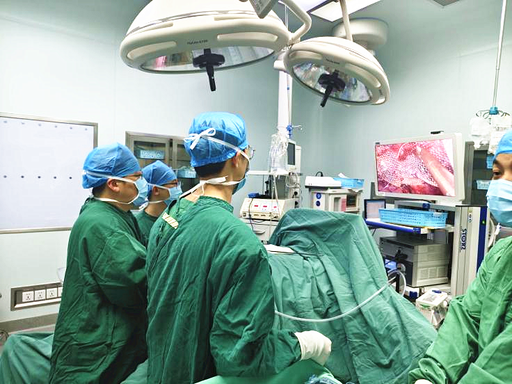 腹腔镜手术场景,李国玉副主任医师正在操作(中)