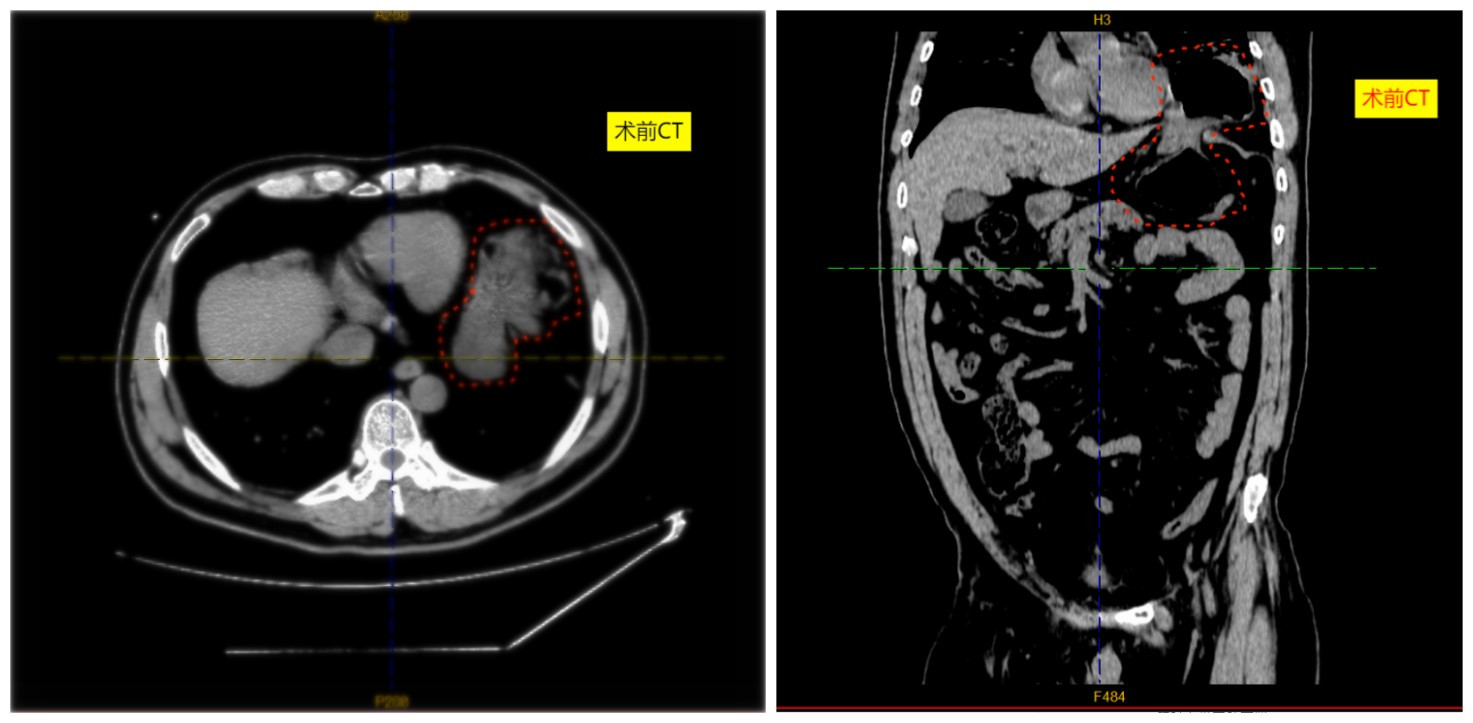 患者冯先生(化名),60岁,因“腹胀腹痛8小时”紧急来院。此前他曾有反复上腹痛史2年余,此次发病突然,疼痛剧烈。急诊CT检查提示:膈疝并嵌顿,由于疝内容物(约1/3胃及大网膜)已嵌入胸腔,如不及时处理,可能导致嵌顿组织缺血坏死、感染甚至危及生命,情况危急!