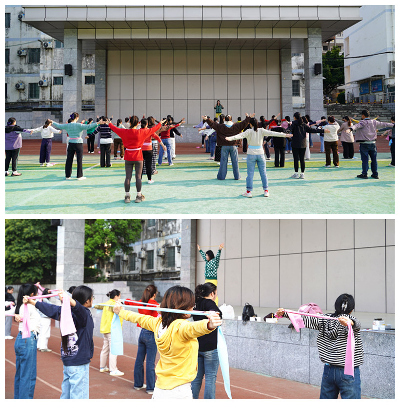随后大家移步操场,在教练的带领下运用拉伸带开展户外健身活动。现场气氛热烈,洋溢着温馨愉悦的节日氛围。