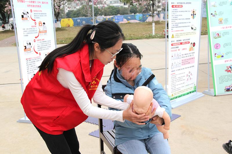 志愿者为居民讲解婴儿海姆立克急救法操作要点