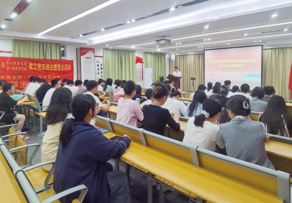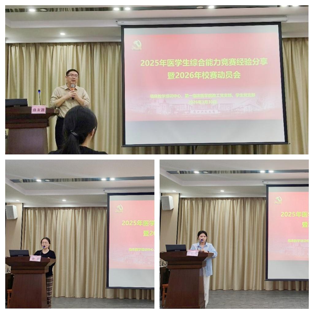 为总结2025年广西医学生综合能力竞赛经验,激发临床医学专业学生的参赛热情,提升学生临床实践能力与综合素质,2026年3月30日晚,由我院临床教学培训中心主办的“2025年广西医学生综合能力竞赛经验分享暨2026年校赛动员大会”在党员活动室举行。临床医学专业2022级、2023级学生齐聚一堂,共同聆听前辈经验,吹响新一年备赛的号角。