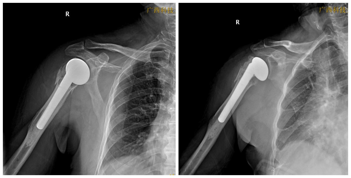 骨科团队全面评估病情,完善术前检查,排除手术禁忌症,与患者及家属充分沟通后,制定个体化手术方案:行右侧人工肱骨头置换术手术在全麻下顺利完成,创伤小、出血少、时间短。术后即刻:骨折端疼痛明显减轻;术后早期:即可逐步开展康复锻炼;术后复查:假体位置良好。