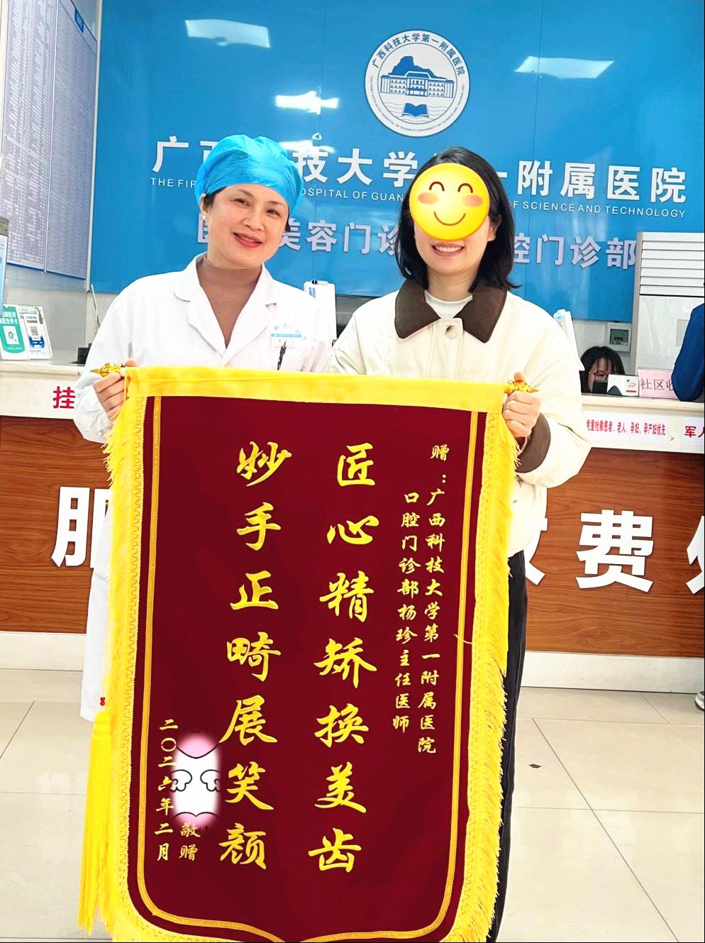近日,患者小雅(化名)将一面写有“匠心精矫换美齿,妙手正畸展笑颜”的锦旗送到了广西科技大学第一附属医院口腔门诊部口腔正畸科专家杨珍手中,再三感谢杨珍主任医师及口腔科门诊全体医护团队帮她解决了多年的牙齿困扰,重拾自信笑容。