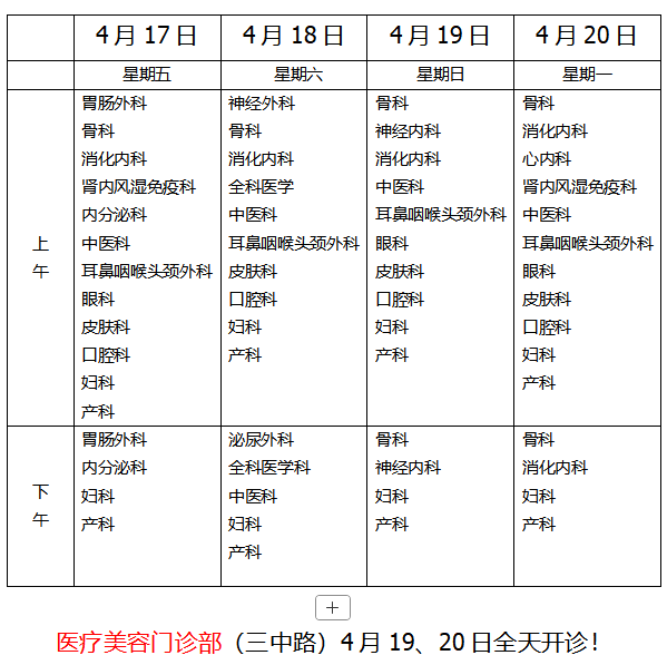 二、内科、外科、妇产科均安排有医师出诊(见下表),具体出诊医师请登录“广西科技大学第一附属医院”微信服务号查询,或咨询门诊服务台:0772-2531722。住院病房、临床检验、超声医学科、医学影像学科等科室均安排值班医师应诊。