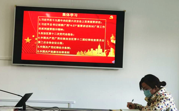 会上,党支部书记陈晓敏带领全体党员学习《习近平在十九届中央纪委六次全会上发表重要讲话》、《习近平总书记视察广西“4·27”重要讲话和对广西工作的系列重要指示精神》、《自治区第十二次党代会报告》、《中国共产党广西壮族自治区第十二届纪律检查委员会第二次全体会议公报》、《中国共产党纪律处分条例》、《中国共产党廉洁自律准则》等相关文件。陈晓敏书记号召教师党员要认真学习习近平总书记重要讲话精神,积极投身广西的发展建设中,严格遵守党的纪律,增强政治定力,立足岗位,以身作则,将廉洁自律贯穿到实际工作中。