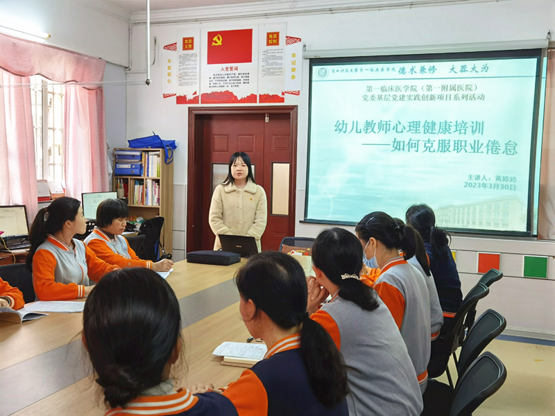 作为第一临床医学院(第一附属医院)党委基层党建实践创新项目系列活动之一,辅导员黄婷婷利用自己的心理学专长,为幼儿园二十多名教师和保育员开展了《幼儿教师心理健康培训——如何克服职业倦怠》专题讲座,生动实用的讲座内容获得了老师们的一致好评。