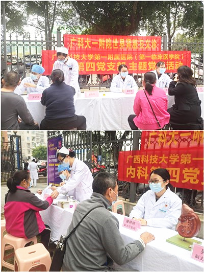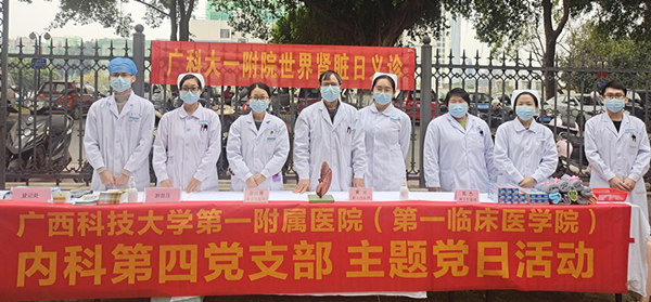 2022年3月10日是第十七个世界肾脏日(Workd Kidney Day),为配合今年的主题“人人关注肾脏健康——吾爱吾肾,知识强肾”,3月10日早上,广西科技大学第一附属医院内科第四党支部的同志们通过线下义诊和线上问答,为广大市民进行肾脏知识科普,筛查早期肾脏病,用知识行动帮助人民群众强肾护肾,减少肾脏相关疾病对健康造成的影响,赢得了好评。