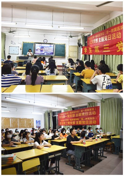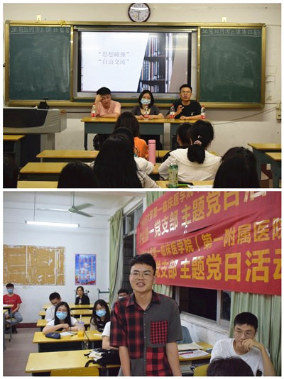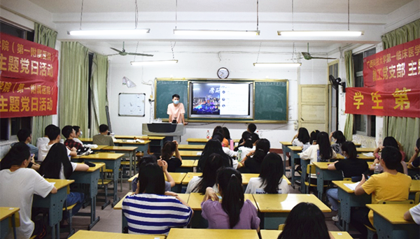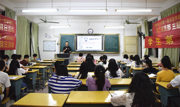 广西科技大学第一临床医学院教工党支部切实落实“我为群众办实事”,2022年5月18日晚,联合学生党支部,在白沙教学点开展“党建引领 助梦前行”主题党日活动——临床医学专业第二场考研分享会,第一场考研分享会主要针对“专升本”同学。这次考研分享会主要针对临床医学本科普通班40余名同学,由2021年考研成功的临床医学2017级学生代表杨伟航、黄道杰和范秋旺进行考研经验交流。教工党支部书记陈晓敏老师主持会议。