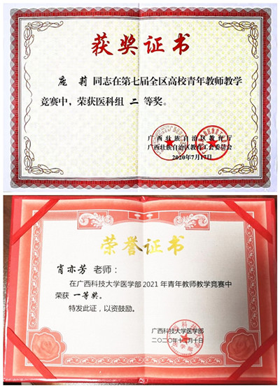 强国复兴有我,坚守教育有责。教工党支部党员的核心工作是教学,主要承担学院本、专科层次的临床医学、康复医学、口腔医学等八个专业三十多门专业课程的教学任务,党员教师们立足岗位、恪尽职守;坚持以学生为中心的教学理念,勇于开展教学改革课题研究,2021年度,支部党员庞莉获学校课堂教学改革与创新专项项目立项“‘新医科’背景下《妇产科学》授课的教学研究”;陆莉静“《眼科学》课程思政研究与实践”获2021年度广西科技大学“课程思政”教学改革与研究专项项目;徐维参编由中国言实出版社出版的教材《中国优秀传统文化》;充分利用网络、多媒体等开展线上和线下教学,应用病例教学法、情景模拟、翻转课堂、MOOC、对分课堂等教学方法和手段,让学生由被动学习变为主动学习,实现有效教学。支部还协同教学办努力提升教师队伍的教学能力,积极参与教学比赛,以赛促教,支部党员庞莉荣获2020年第七届全区高校青年教师教学竞赛中荣获二等奖、肖亦芳荣获2021年医学部青年教师教学基本功比赛荣获一等奖等。