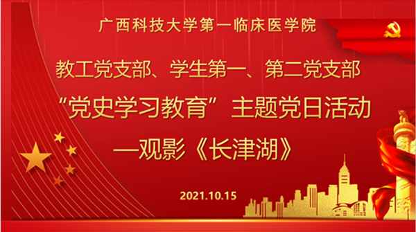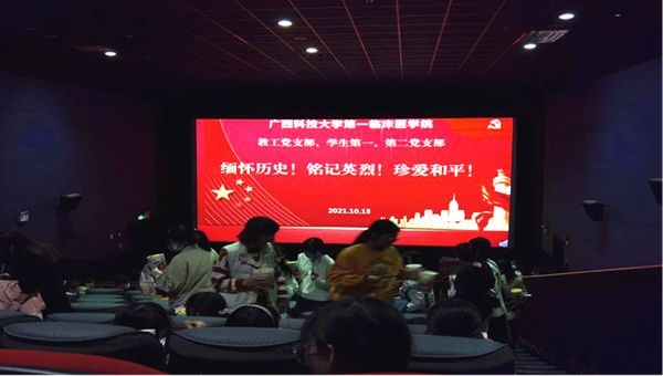今年是中国共产党成立100周年,中国人民志愿军抗美援朝出国作战71周年,为缅怀历史、铭记英烈、珍爱和平,践行“学党史 感党恩 跟党走”,2021年10月15日晚,广西科技大学第一临床医学院教工党支部、学生第一、第二党支部开展了“缅怀革命先烈 传承红色基因”党史学习教育主题党日活动,在柳州市城中万达影城组织支部109名党员观看了红色电影《长津湖》。