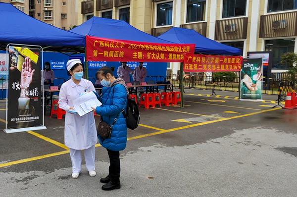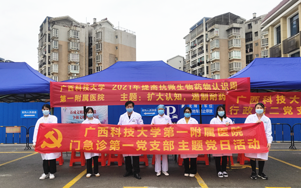 11月22日上午,广西科技大学第一附属医院门急诊第一党支部、行政第二党支部在门诊楼前联合开展“2021年提高抗微生物药物认识周”宣传义诊活动,广泛宣传抗微生物药物合理使用知识,特别是在常态化新冠肺炎疫情防控下,如何正确使用抗病毒药物、抗菌药物等;提高社会公众和医务人员对耐药危机的认识,减少不必要的药物使用;营造全社会关心、支持和参与抗微生物药物合理使用的良好氛围。