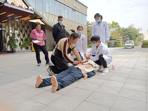 党员志愿者在保利商业广场为群众进行心肺复苏技能培训