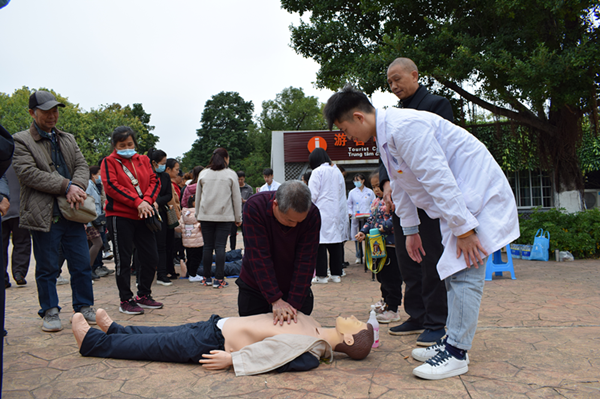 党员志愿者在雀儿山公园为群众进行心肺复苏技能培训