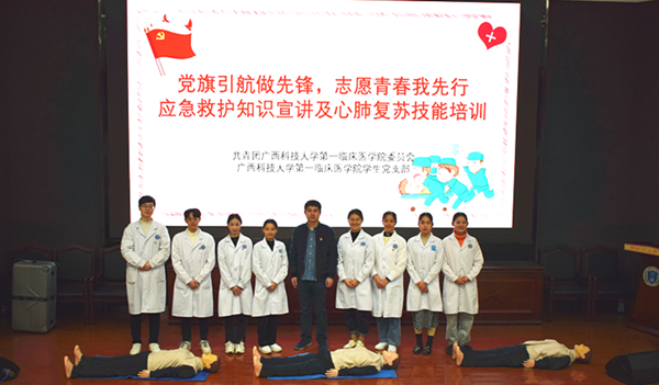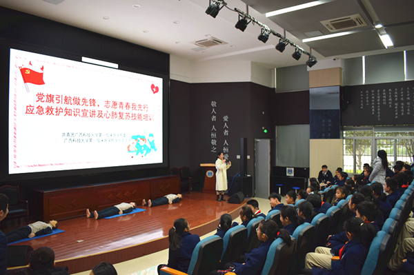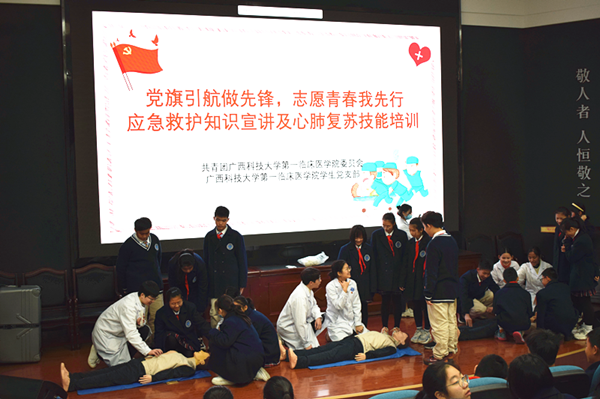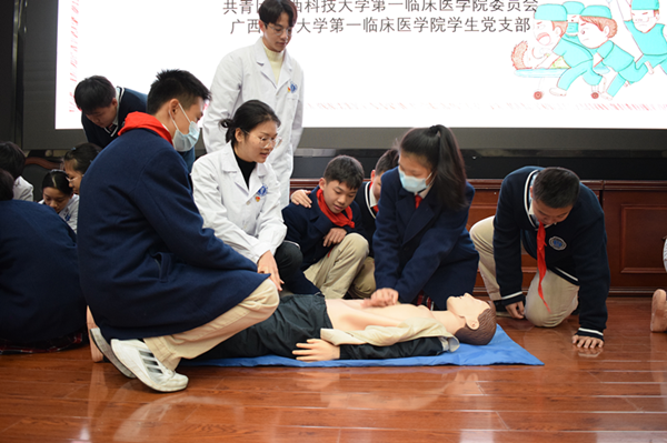 12月13日,广西科技大学第一临床医学院党员先锋志愿服务队来到柳州市文华中学,开展应急救护知识宣讲及心肺复苏技能培训。党委副书记何曲波在文华中学升旗仪式上进行了动员讲话,讲明了在全民普及应急救护知识的重要意义,鼓励文华中学全体学生要积极踊跃参加培训。