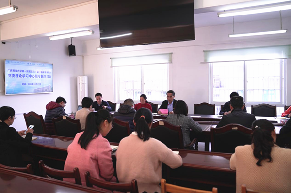 12月17日下午,广西科技大学第一附属医院(第一临床医学院)召开党委理论学习中心组专题集中学习会,会议就党的十九届六中全会、自治区第十二次党代会等重要会议精神进行了学习。院党委书记庞晓红、党委副书记何曲波、纪委书记潘旭、副院长李俊、总会计师向桂云以及中心组成员、各科室负责人代表、中层干部代表参加了会议。