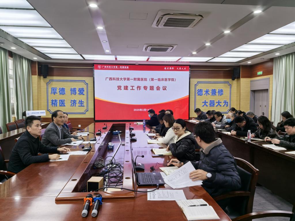 为进一步夯实全面从严治党政治责任,奋力开创党建工作新局面,推动落实医院(学院)高质量发展全面提质提速,2月14日,广西科技大学第一附属医院(第一临床医学院)在实验综合楼1楼会议室召开2025年党建工作专题会议。医院(学院)党委书记庞晓红同志,党委副书记何曲波同志,纪委书记潘旭同志出席会议。全体党支部书记参加会议。会议由何曲波主持。