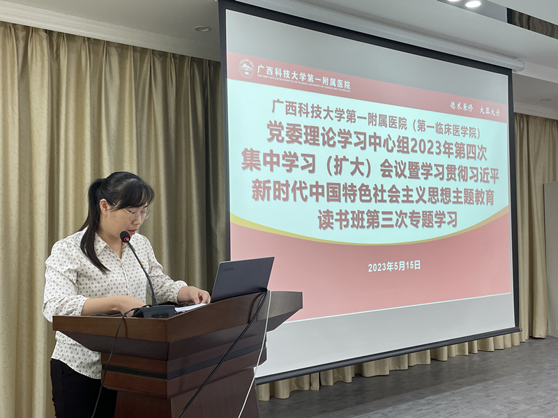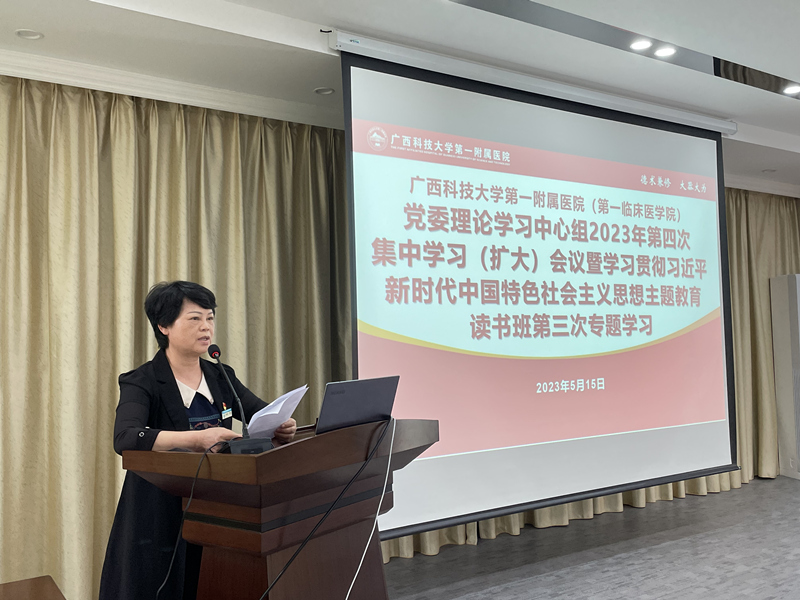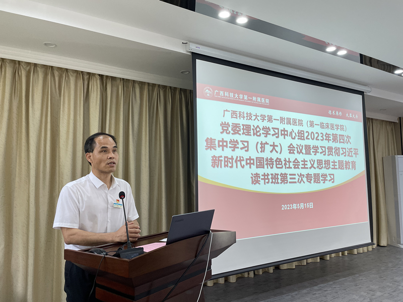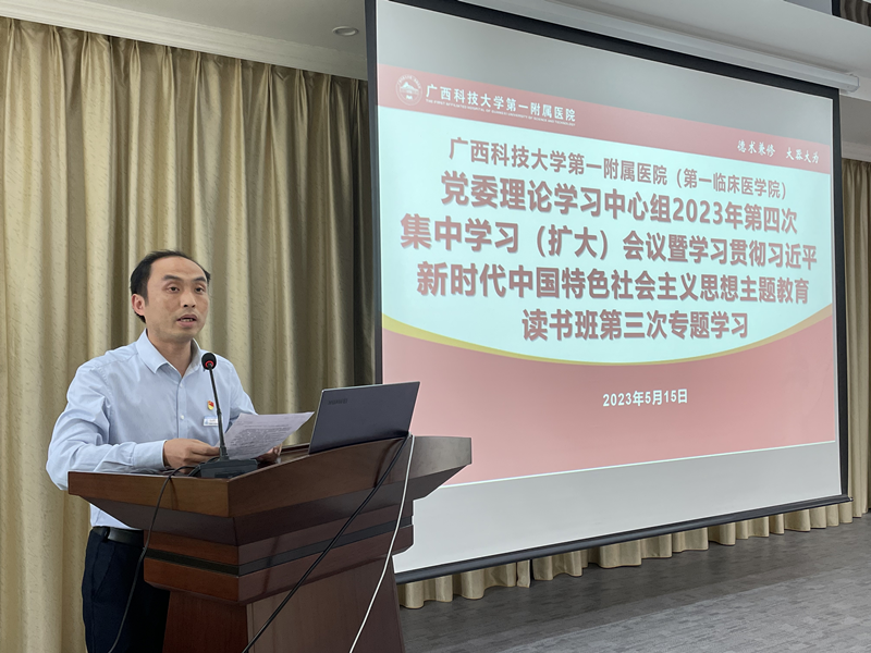 根据广西科技大学第一附属医院(第一临床医学院)学习贯彻习近平新时代中国特色社会主义思想主题教育工作部署,5月15日下午,我院党委学习贯彻习近平新时代中国特色社会主义思想主题教育读书班第三次专题研讨暨党委理论学习中心组学习(扩大)会在党员活动室召开。专题学习《习近平新时代中国特色社会主义思想专题摘编》,围绕“以深化改革为动力,助推医院(学院)高质量发展”开展专题研讨。