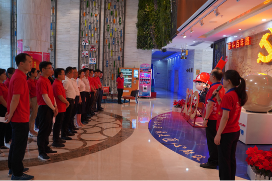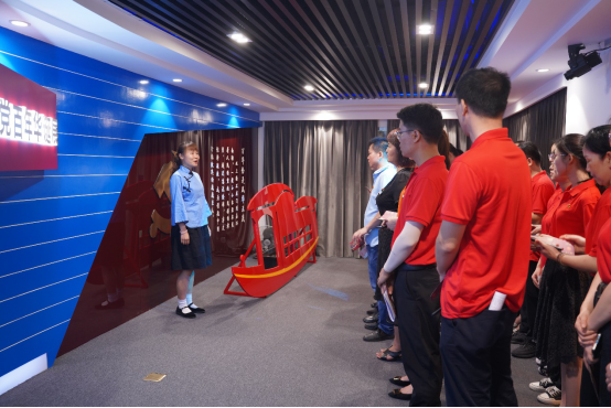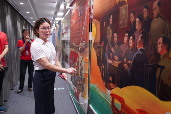 紧接着,穿过一楼的企业党建品牌展示长廊,参观学习组一行来到了位于二楼的主题展厅,在进入展厅前,每一位党员都拿到了“100号航船”的“船票”,随着一段悠扬的歌声,大家的思绪被带回到1921年那艘孕育着希望的红船上。在这里,由覃莲、覃天分别为全体党员开启“红船精神”和“新中国成立”的历史篇章,一幅幅主题展板讲述了一路走来我党的百年风华,党员代表情绪高涨的现场领读,让党的光辉思想、优良作风发扬传承。同时,全体党员还在二楼观看了建党百年宣传短片。
