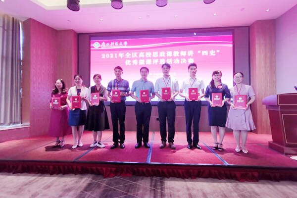 为进一步推动习近平总书记“七一”重要讲话精神往深里走、往心里走、往实里走,深入贯彻落实习近平总书记关于加强“四史”教育的重要指示批示精神,积极引导教师修身立德,争做新时代塑造学生品格、品行、品味的“大先生”,由自治区党委教育工委、自治区党委宣传部主办,我校承办的全区高校思政课教师讲“四史”优秀微课评选活动决赛于7月26日在柳州顺利举行。