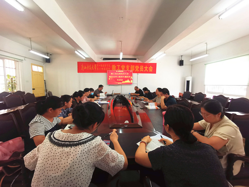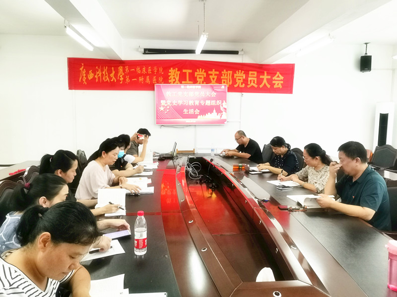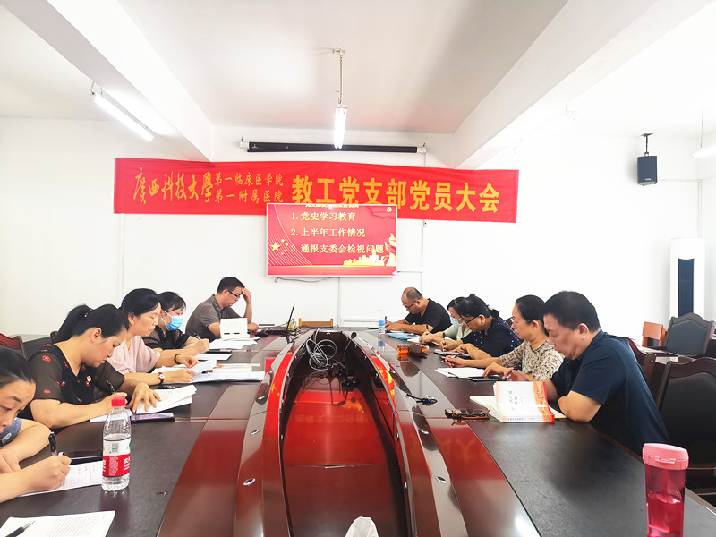 2021年7月26日下午广西科技大学第一临床医学院教工党支部召开党员大会暨党史学习教育专题组织生活会。学院党委副书记何曲波、学院党委原副书记陈恒(现任学校医学部药学系党总支书记)以普通党员身份参加组织生活会。会议由教工党支部书记陈晓敏主持。