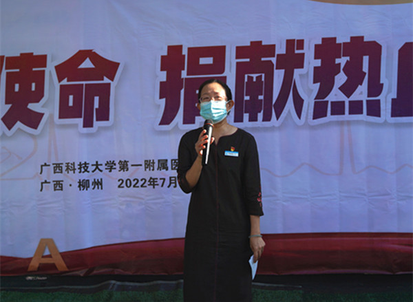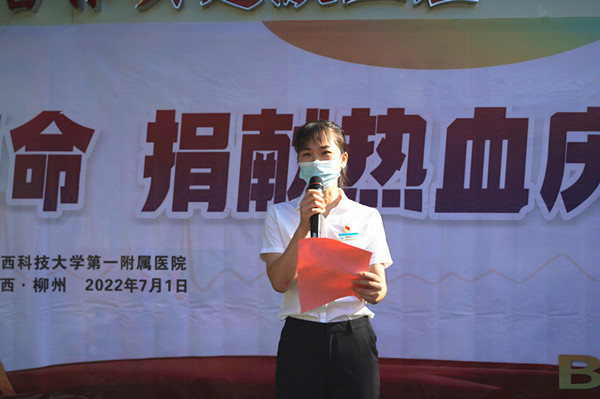 抗疫队员献血代表覃晓纳宣读无偿献血倡议书