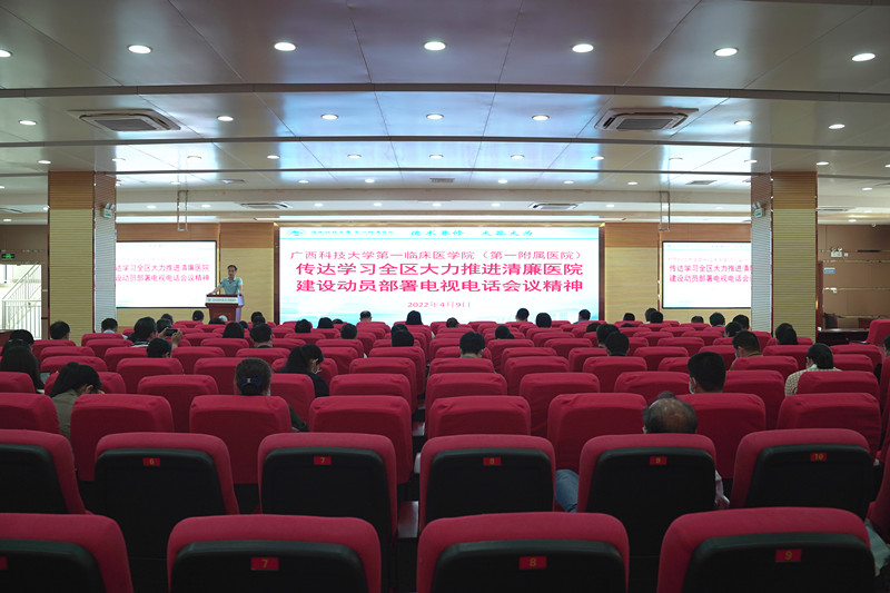 4月9日上午,广西科技大学第一临床医学院(第一附属医院)召开传达学习全区大力推进清廉医院动员部署电视电话会议精神专题会议。庞晓红书记进行领学,院领导班子全体成员、全院中层干部、护士长共计100多人参加了学习。