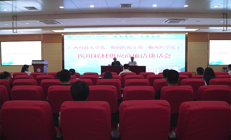 结合医院正在开展的纠治医疗卫生领域腐败和作风问题专项行动,扎实推进清廉医院建设,营造风清气正、和谐规范的购销环境,从源头上遏制医药购销领域不正之风,防范商业贿赂,维护医院正常医疗秩序。5月24日下午,广西科技大学第一附属医院在医院学术报告厅召开医用耗材供应商廉洁谈话会议。医院党委副书记、院长覃天,副院长张施明,纪委办监察室、行风办代表及30家医用耗材供应商代表参加会议。会议由副院长张施明主持。