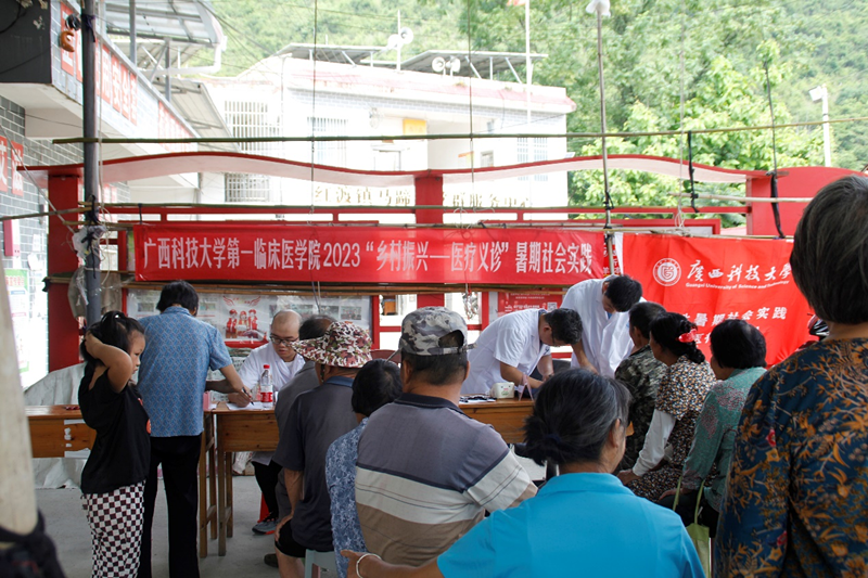 开展暑期社会实践是深入学习宣传贯彻党的二十大精神,贯彻落实《教育部关于进一步加强高校实践育人工作的若干意见》精神的重要举措。广西科技大学第一临床医学院围绕“实践树德、实践增智、实践健体、实践育美、实践强劳”的实践育人理念,组建了乡村振兴健康义诊医疗服务队,开展暑期“三下乡”社会实践活动。7月17日,“三下乡”社会实践活动至来宾市忻城县红渡镇马蹄村开展义诊小分队为村民开展健康义诊。第一附属医院风湿免疫科主任骆字验等专家坐诊,党团员及青年志愿者参加。本次活动由第一临床医学院辅导员黄非老师带队。