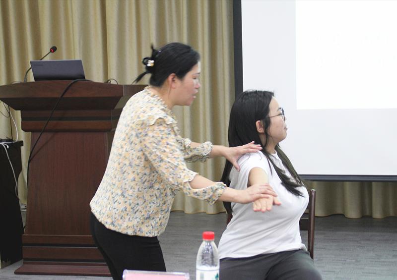 杨教授还针对头发出油、脱发、白发这三个常见问题的原因、及治疗方法进行了详细讲述,其中治疗方法包括内疗、外疗和穴位按摩,为让同学们能更好掌握穴位按摩,老师通过现场互动演示的形式讲解,同学们积极参与。